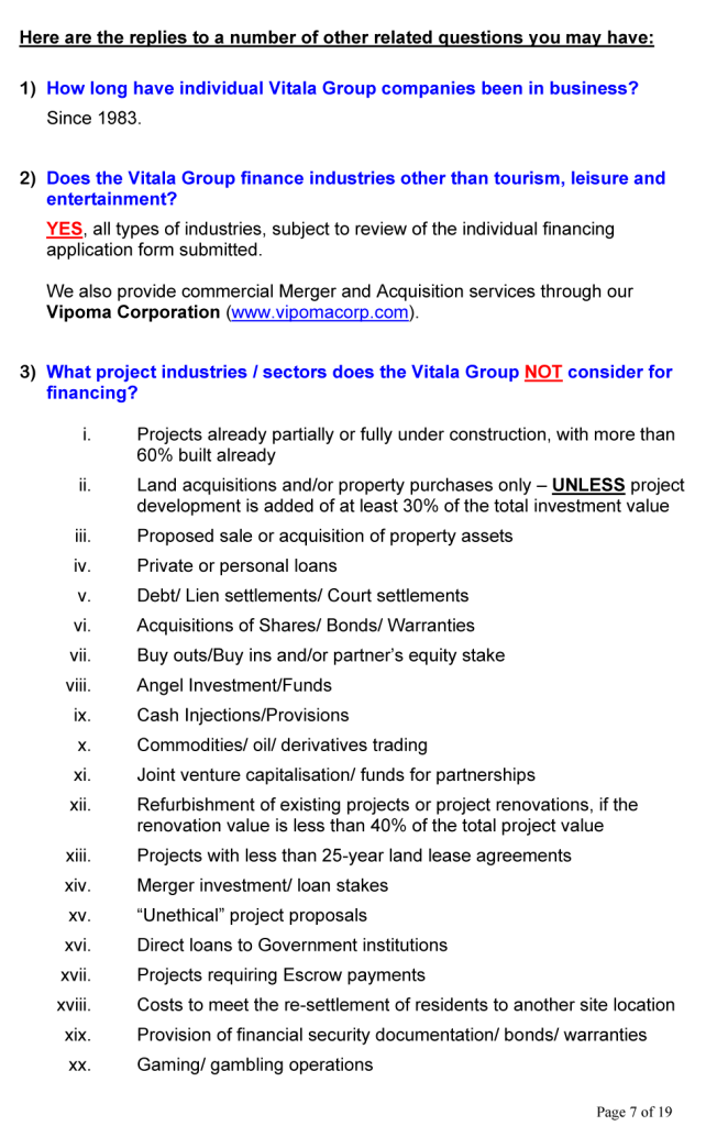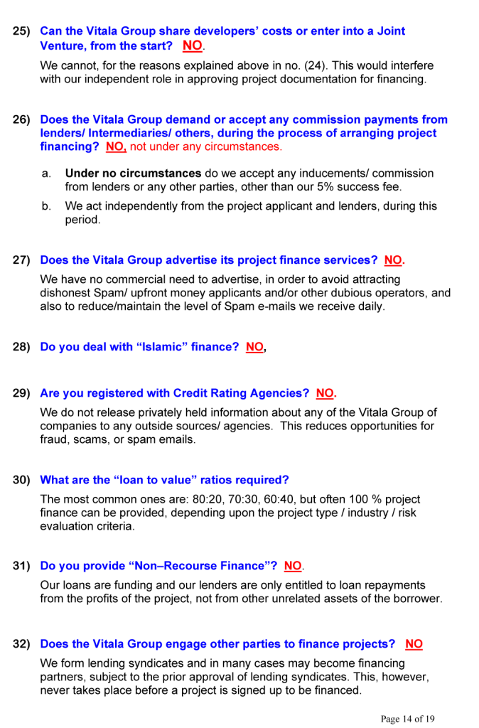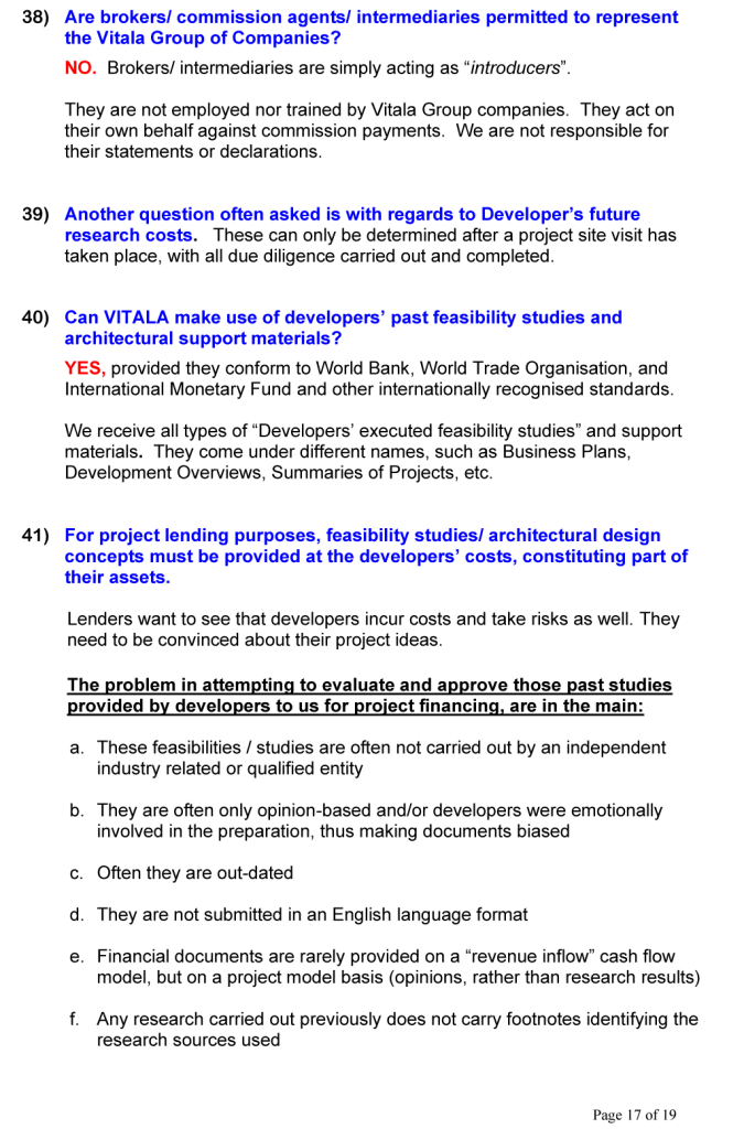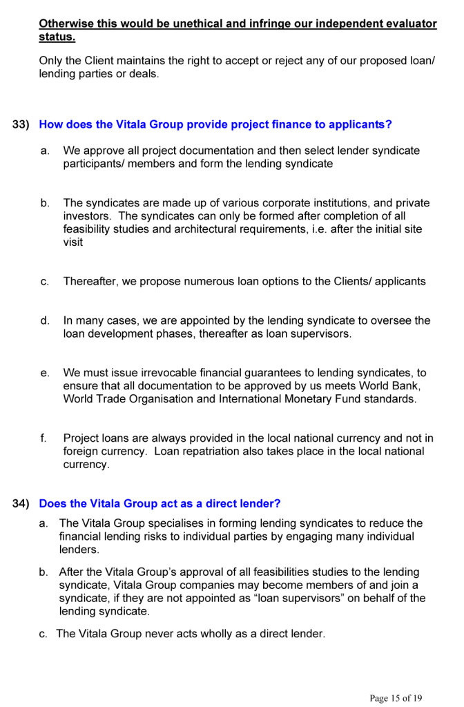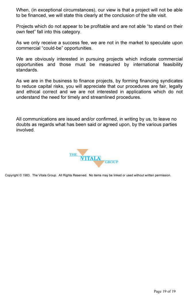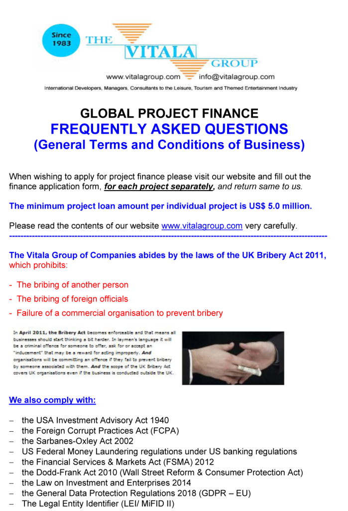 BUSINESS OPPORTUNITIES & PROJECT FINANCE Stan Etkind is a representative of the Vitala Group regarding commercial cooperation. For more information on the Vitala Group Projects, click on the button below. Schedule of International Project Experience Download the Project Finance Application Form and return the completed form to us. Project Finance Application Form GLOBAL PROJECT FINANCE - FREQUENTLY ASKED QUESTIONS (FAQ) WE OFFER A DIRECT PERSONAL SERVICE WITH LIVE INTERACTION.WE ARE HONEST AND ETHICAL.PLEASE NOTE: SERIOUS BUYER’S ENQUIRIES ONLY.WE DO NOT ASSIST UNQUALIFIED BUYERS, SELLERS, TIME WASTERS AND BAD ACTORS.